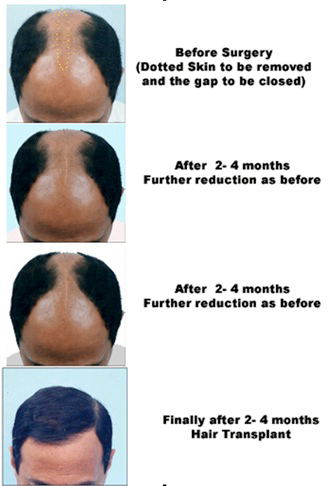 In stage 6 or 7, most of the Hair roots have died and few remaining hairs are of poor quality in the central scalp. So in 2-3 small procedures the central scalp skin with hair loss is serially reduced and the hairs on the sides (above the ears) are shifted more near the center of the scalp with each stage. Finally only a narrow strip and the hair line area is left for the last stage when the Hair Transplant is performed from hairs taken from the back side of the head to give the cover to the head.
