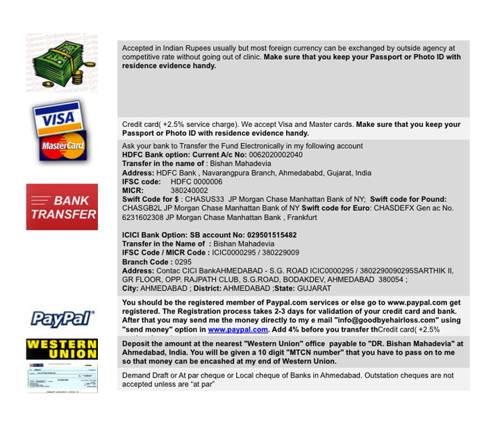 you should be the registered member of Paypal.com services or else go to www.paypal.com get registered. The Registration process takes 2-3 days for validation of your credit card and bank. After that you may send me the money directly to my e mail "info@goodbyehairloss.com" using "send money" option in www.paypal.com. Add 4% before you transfer the money.