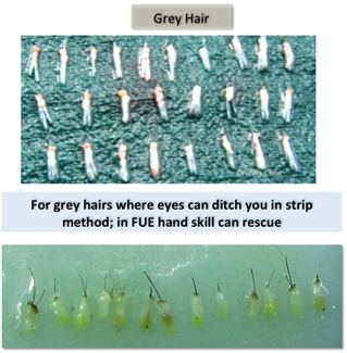 Because the grey or white hair against same coloured tissue is practically impossible to distinguish even under the best microscopes the transaction rate of white hairs by Strip method is very high. FUE on the other hand works on the manual feel technique and not on the tissue colour visualization and therefore does not have any additional disadvantage of having white hair because the transaction rate does not go up.
