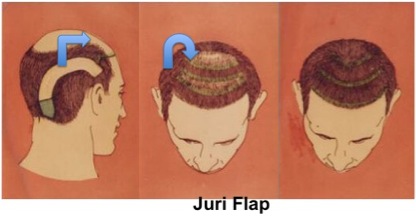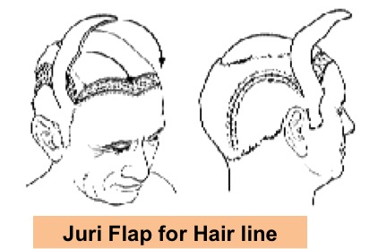 Flap is the tongue of tissue or skin where one end is attached to the body for the blood supply. This major surgical procedure and involves majors visible scar. Although some scalp Flaps were devised for the common baldness hair coverage there are major disadvantages of extent of procedure, scarring, abnormal direction and look of patient. e.g. Juri flap |