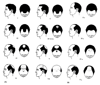 The Norwood classifications were adapted from the patterns described by Dr. O'Tar Norwood. There are seven classes of hair loss in the main series and five variations of these classes called the 'A' series. If you compare your hair loss pattern with these diagrams, you can probably see the pattern you are in now. Discussion with one of NHI's knowledgeable physicians can help you determine how extensive your hair loss may become. Please see Assessing Your Hair Loss for more info.