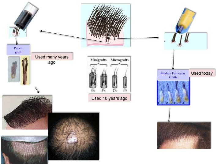 Hair plugs name originated in the 1950’s when hair transplantation procedures were first being used. At that time the state of the art in microsurgery did not exist so surgeons were forced to work with large circular or cylindrical block of bunch of hair of scalp skin from the backside of the head. This gave results that looked like the artificial hair that is plugged into a cheap dolls head. The results were not really as good as they could have been. . This gave a result that was not very pleasing as the hair tufts tended to just stick up in unnatural direction. This is actually where the term hair plug came from. The transplanted hair looked like the plugs of hair that are stuck in a cheap dolls head. Most of the time the procedure was very noticeable like the bristles of the toothbrush or appearance of cornrow.