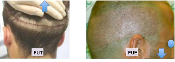 2. FUT (Follicular Unit Transplant (Also known as Strip method or FUSS_ Follicular Unit Strip Surgery). This is the method where a strip of hair bearing skin is taken from the backside of scalp and the roots are then separated individually from this and then planted in the area of hair loss area. After removal of strip the gap is stitched up by stretching the edges of gap by fine plastic surgery stitches.