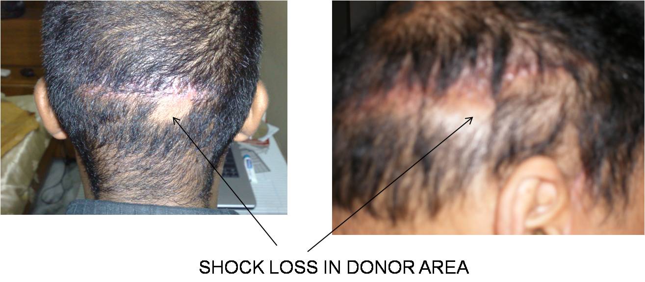 Due to the Minimally invasive nature of FUE the incidence of Shock loss is believed to be much less in donor area compared to that in Strip surgery with more invasive nature. This is usually a temporary loss and may take few weeks to few months to fully recover. This is not permanent.