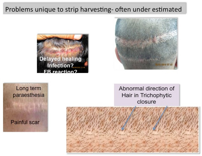 5-10 % of people undergoing Strip Procedure in spite of the best techniques and educated judgment by the Doctor across the world may encounter problems due to stitches such as Foreign Body reaction, delayed absorption and spitting of stitches, stitch abscess. Widened scar may be seen in some skins or in athletes. Tightness of scalp, Painful scar, long term parasthesia or reduced sensation above the linear mark may be seen rarely. Even trichophytic closure may encounter problems such as abnormal hair direction of hair growing through the scar. Fortunately most of these problems are treatable and are not of serious nature.